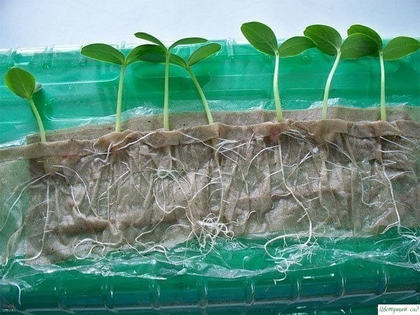 я делаю проще. Лента целлофановая, на нее туалетная бумага и через 5!!! см семечко. Потом скручиваю и ставлю в разрезанную поперек! бутылку. В пяти литровую несколько рулончиков помещается. Наливаю на дно воду со стмуляторами. Или просто. Как промочится бумага, еще на см. А сверху верхушку бутылки без пробки. Вот таким образом и отделять росточки удобно, чтобы посадить.