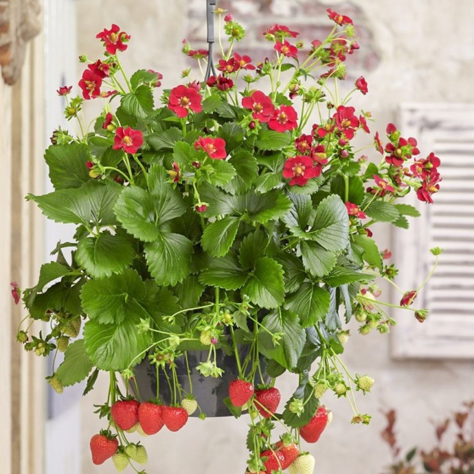 Клубника ремонтантная Грандиан F1. Сладость, которую можно выращивать на грядке, в кашпо и даже на балконе. На огороде усы укореняются и плодоносят в первый год. В контейнерах усы изящно свисают и завязывают ягоды даже на вторых неукорененных розетках. Можно использовать как ампельный сорт для украшения вертикальных композиций.
