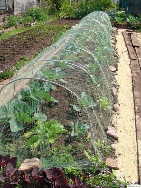 Сетка оберегает капусту от бабочек, при этом не мешает поливу и подкормкам.
