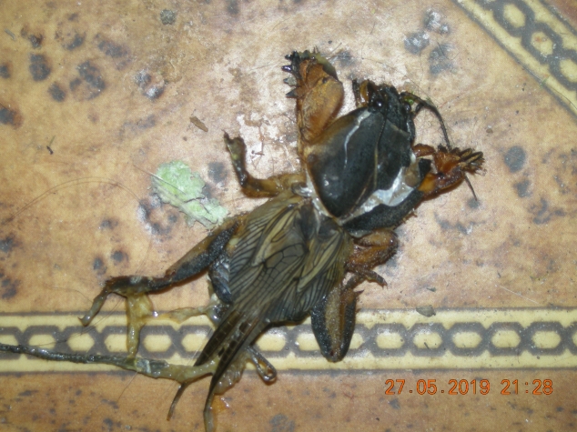 Добрый вечер. Кошка притащила домой какую то живность шевелящуюся. Отняли, стали рассматривать...и не поняли - кузнечик, или кто? Размером см 5. Подскажите. (Извиняюсь-придавили немного от страха.)