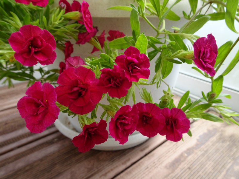 Вот меленькие цветочки — это не петуния, а Калибрахоа, они скорее всего родственники. Листики мельче и цветочки тоже. Они у меня зимуют дома в прохладном помещении.