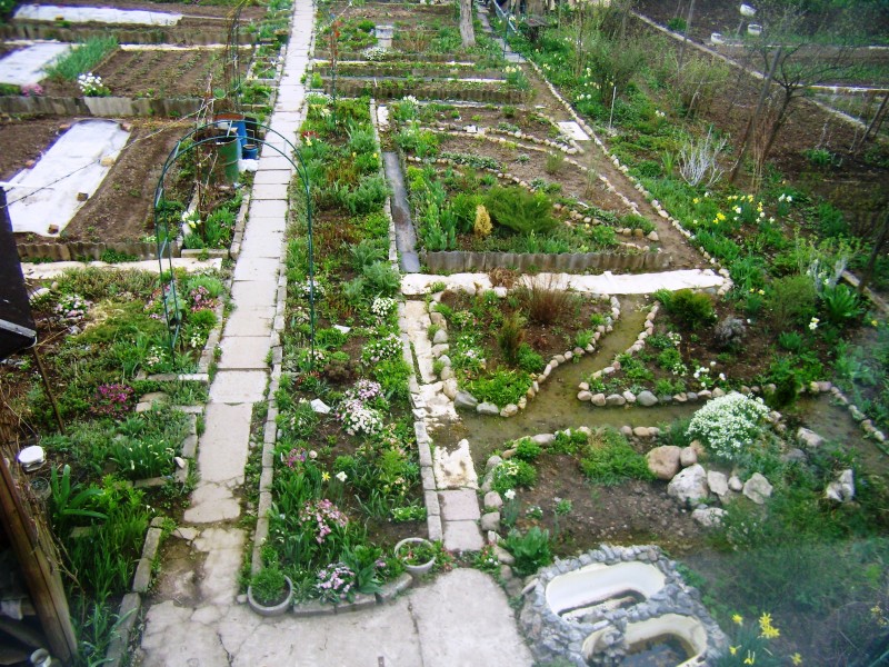 зоны. Слева в середине огород, справа и по периметру сада - цветники и кустарники.