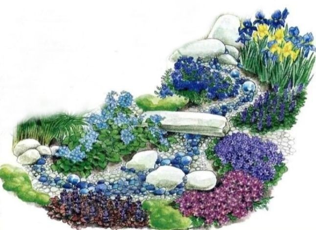 Неправильно отталкиваться от того, что есть. Надо планировать из того, что нужно. Для того варианта цветника, что предложила я, можно взять самшит или можжевельник наверх насыпи, ирисы им в ноги, хосты по краям ручья, очиток — по ручью, естественно. Забейте в поиск список цветов синего цвета, если решили подбирать в этой гамме.