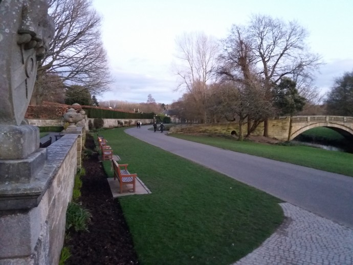 В парке вдоль каменных стен и кустарников много тяжелых дубовых скамеек. На спинках скамеек, если внимательно присмотреться, можно разглядеть железные бирочки с именами ( годами жизни и смерти) умерших, чьи родственники прикрепляют их к скамейкам, чтобы люди, садясь на них, читали их имена и помнили. Эта традиция очень укоренилась здесь и вызывает восхищение.