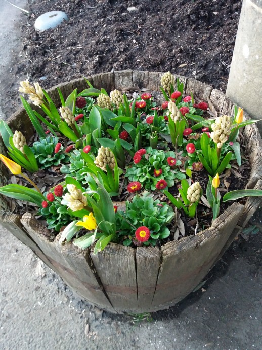 На главной центральной площадке парка всегда групповая инсталляция типа альпийской горки. Может меняться несколько раз за сезон. В прошлом году быть корабль на волнах "окруженный " тропическими островками" с пальмами - все растения высаживаются непосредственно в грунт и инсталляция делается исключительно из деревьев, кустов и цветов. В начале этого сезона - инсталляция из группы хвойников. Сейчас, на больших клумбах, гиацинты, примулы, голубые колокольчики, нарциссы, тюльпаны, (крокусы отцветают) и другие ранне-весенние.