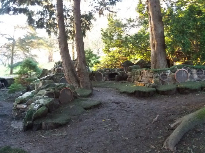 Под огромными соснами и лиственницами - расположилась деревня " хоббитов" и дракон, охраняющий ее жителей; ).....Рай для детворы, хотя с другой стороны парка им отведена огромная площадка с кучей всяких качелей и прочих развлечений.