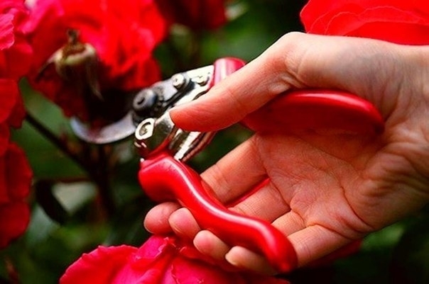Обрезка крупноцветковых роз после цветения немного отличается. Вместе с цветком срезают и стебли с неполными листьями и как минимум одним пятёрчатым листом. Этот прием пробуждает розу к цветению.