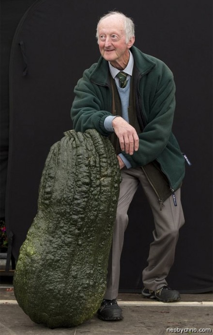 |Это — Брайан Маршалл из города Ноттингем, который позирует со своей тыквой-рекордсменом, чья масса была измерена на недавней выставке цветов в Великобритании и составила 230 килограммов (или 507, 06 фунтов).