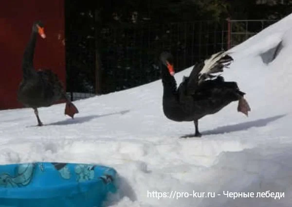 Зимой, в относительно теплые солнечные дни, птица находится в вольере. Лебеди охотно резвятся на снегу и с удовольствием копаются в нем.