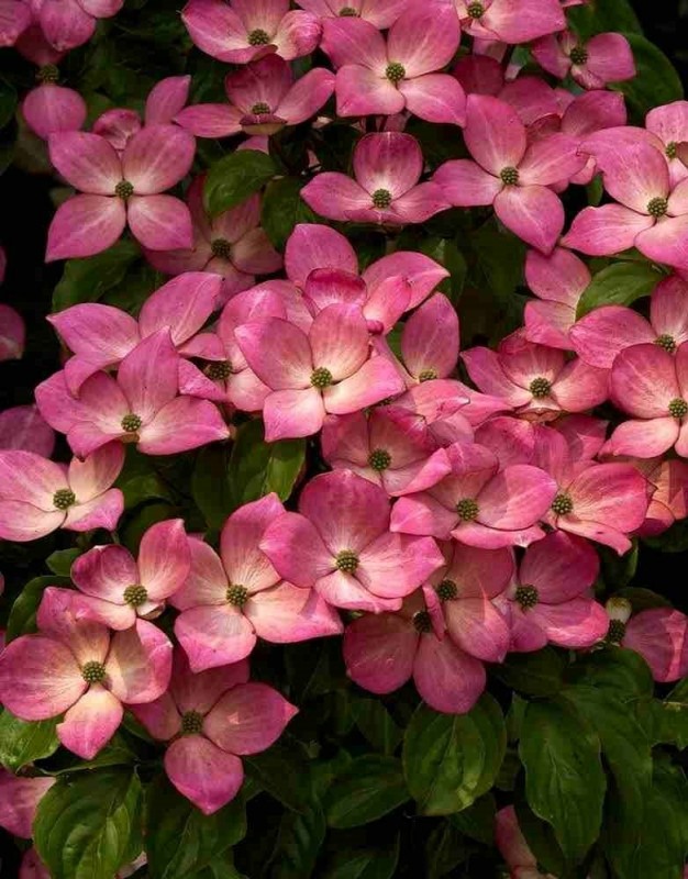 Соцветия у этого дерна довольно неприметные, желто-зеленые. Но каждое соцветие окружено четырьмя крупными розово-красными прицветниками (видоизмененными листьями).
