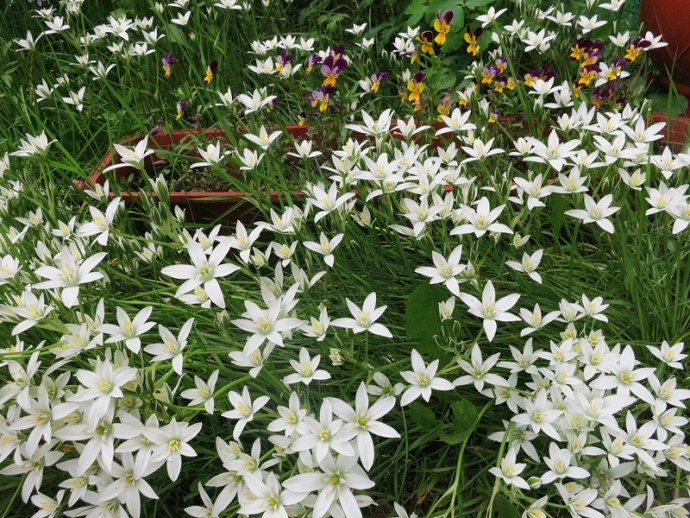 Птицемлечники — тоже же белые! Настоящие звезды! Посмотрела на фотографии — сделала для себя выводы: у нас птицемлечники растут вдоль дорожек по самому краю (мне нравится, что прямо из-под снега их трогательные изумрудные иголочки-листики такой радостной щеткой поднимаются), поэтому к тому моменту, когда им цвести, их очаровательные листочки уже полегают от жаркого солнца.А у Вас они среди других растений не на самом-самом краю, хотя тоже вдоль дорожки — и листики стоят иголками отлично. Я не могу такой широкой полоской посадить, потом же нужно чем-то восполнять пустоту) Придется пересадить куда-то, а тут чем-то заменить. Так что спасибо за подсказку.