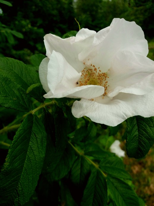 Да, это садовая герань, в прошлом году такую посадила, была примерно такого же размера, а в этом году выдала нам большущие листья — очень много дождей непрестанных, а почва и уход у нас хорошие. Голубенькие цветочки с прекрасными серебристыми узорчатыми листьями — бруннера. очень разрастается. Иногда нарастают простые зеленые листья, здесь, на сайте, посоветовали их просто удалять, чтобы не допустить «перерождения», поэтому недостаток — нужно постоянно за этим следить. Стелющийся кустарник с золотисто-зелеными листьями — бересклет. бело-зеленая «травка» — райграс. Очень разрастается. Неубиваемая. Прекрасный белый боярышник — не боярышник, это роза морщинистая, или роза ругоза, иногда ее называют морщинистым шиповником.