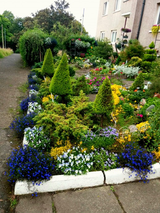 Агератум — это голубенькие цветы? Но я не вижу ручейки, только отдельные кустики. Очень хорошо все обустроено, и я бы не сказала, что это маленькая территория, потому что требует много сил и средств. Это ведь многоквартирный дом, и территория общая, получается, никто из других жильцов Вам не помогает, хотя бы материально? Все растения куплены на ваши деньги? Это большие расходы, ведь многие растения живут только один год. Я восхищена вашей самоотдачей.