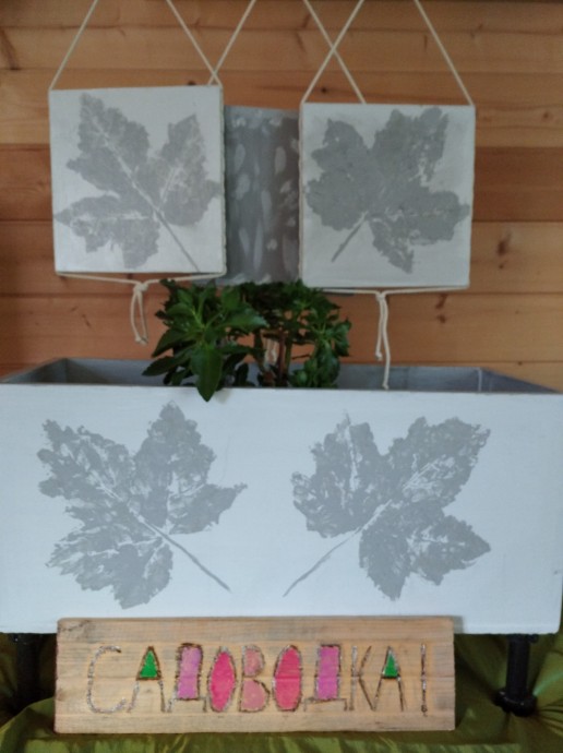 Была у нас полка, нам её родственник отдал, полка вертикальная с тремя полочками. Решила я её переделать. В городскую квартиру нужен был ящик для комнатных цветов. Решено - сделано. Муж усилил дно и прикрутил ножки. Перекрасила я её, внутри темнее, снаружи светлее. И полочки покрасила И всё. Что делать дальше, не знаю. А на Садоводке конкурс. И пришла идея кленовыми листьями рисовать. Очень увлекательное занятие, скажу Вам.) И полочки пригодились, получился триптих: кленовые листья и абстракция ( она случайно получилась). Полочки-"картины" с двухстороннем оформлением. В городе на белой стене будут висеть мои "картины"), а под ними этот ящик с цветами.