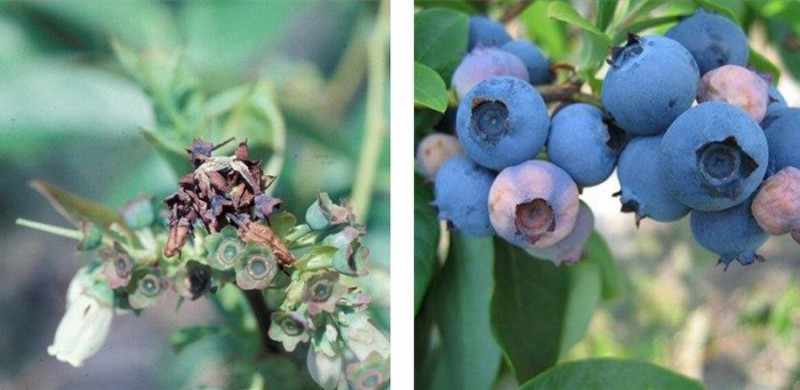 МОНИЛИОЗ вызывает гриб Monilinia vaccinii–corymbosi. Первые признаки плодовой гнили появляются еще до цветения. Гриб вначале поражает верхушки ветвей, а затем листья, соцветия и плоды. Заболевшие части растений выглядят так, словно подморожены. Поросль чернеет и отмирает, а листья засыхают. Ягоды же, пораженные грибом, вначале развиваются, как положено, вырастая до своих размеров, но затем высыхают.