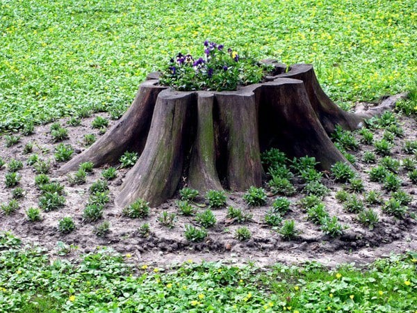 Если у вас на дачном участке есть пень — считайте, что вам повезло. Старый пень по сути уже является готовой основой для создания клумбы. Нужно только освободить его сердцевину и засыпать пространство землей либо же установить горшок с грунтом подходящего размера.Однако, чтобы клумба из пня служила вам долго и верно, следует учесть некоторые нюансы: для создания цветника подходит только здоровый пень. Если древесина поражена опасной болезнью, например, тиростромозом, лучше удалить ее вместе с корневой системой, заменив грунт, иначе заболевание может распространиться и на другие растения; из-за осадков, насекомых-вредителей и других внешних факторов древесина со временем будет рассыхаться, и пень-цветник потеряет свои декоративные свойства. Чтобы увеличить срок службы оригинальной клумбы, спилы пня нужно хорошо зашлифовать и обработать антисептиком (можно использовать и масляную краску). для создания клумбы больше всего подходит старый пень, сердцевина которого уже достаточно усохла. Если же вы хотите создать клумбу из свежесрубленного дерева, вам придется немного подождать, т.к. вытащить из него сердцевину будет очень сложно.