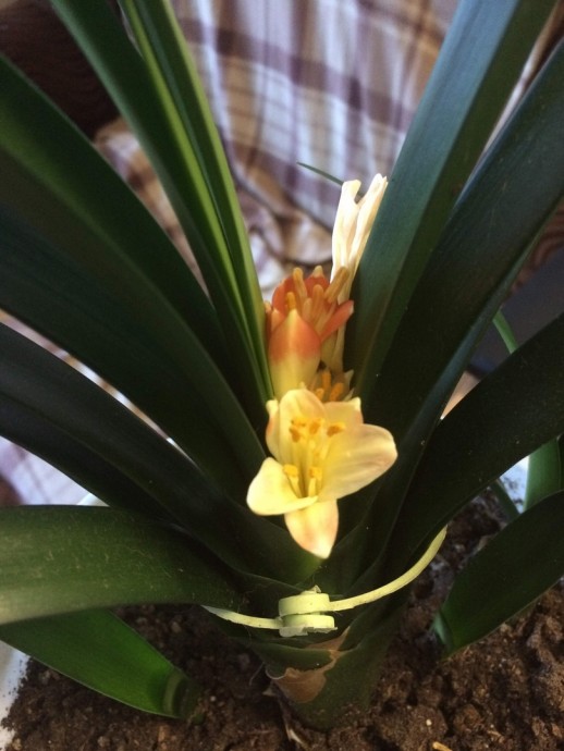 Это кливия киноварная. То, что стрелка не вышла, а осталась между листьев, свидетельствует о том, что что-то ее не устроило в уходе и содержании.
