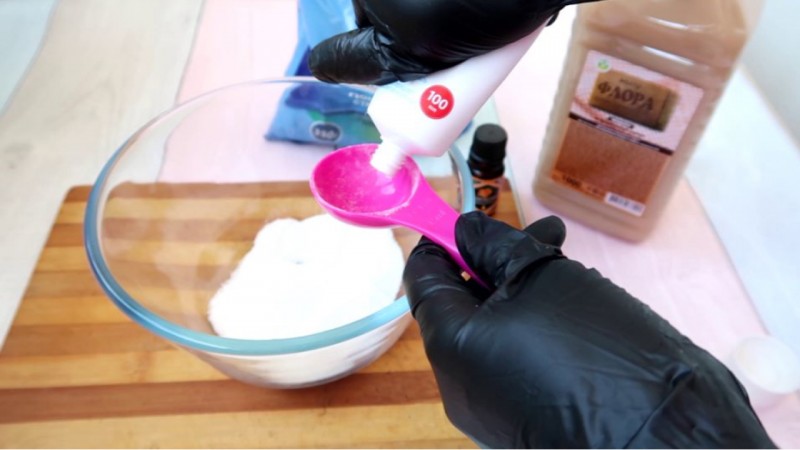 Для их приготовления я беру зубную пасту, мыло, стиральный порошок и также для аромата эфирное масло.