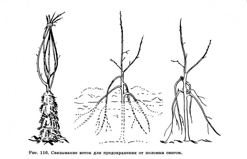 В зимнее время у молодых карликовых и полукарликовых деревьев часто обламываются основные ветви под тяжестью оседающего снега. Для уменьшения поломов в первые годы после посадки можно стягивать основные скелетные ветви пеньковой веревкой. Плотный слой снега весной при оседании можно разрушить с помощью кола или обычных вил. Во избежание полома основных ветвей (скрытых под снегом) к дереву надо подходить только на лыжах. Иногда с осени над ценными сортами с ломкой древесиной ставят высокие колья в виде пирамиды. В этом случае снеговой наст при оседании сам разрушается о кол.