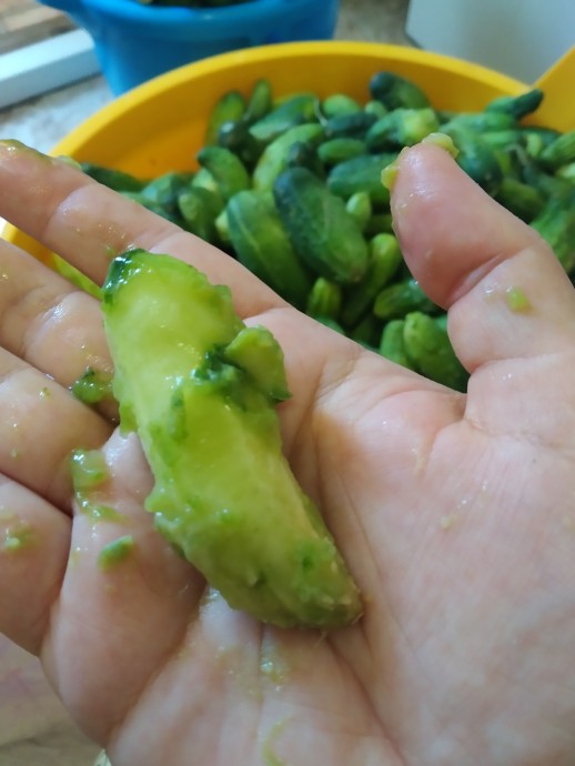 Достаю огурцы из воды. Небольшая часть разваливается в вонючую жижу сразу, ещё в воде — самые мелкие. Некоторые — только кожа слазит. Если оставить обсыхать или не успеваю сразу закатать все в тот же день — таких огурцов становится много. Больше 3 часов огурцы в воде не лежат.