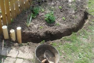 - Затем начинаем устанавливать колышки для бордюра. Делаем это следующим образом: ставим колышек в траншею, обсыпаем землей, закрепив его положение, а далее плотно утрамбовываем грунт.