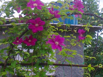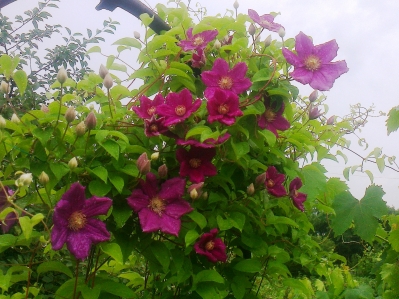 Сорта клематисов разнообразны по форме - от простых, линейных цветков, до махровых, метельчатых самой причудливой формы и размера. Могут быль лазающей лианой или кустиком. Мне по душе больше лиана, она довольно плотно ложится на опору, густым ковром закрывая её. При выборе клематисов нужно обращать внимание на принадлежность сорта к определённой группе обрезки, что бы планировать зимовку растения. По-моему, удобнее необрезаемые (1 группы) клематисы.