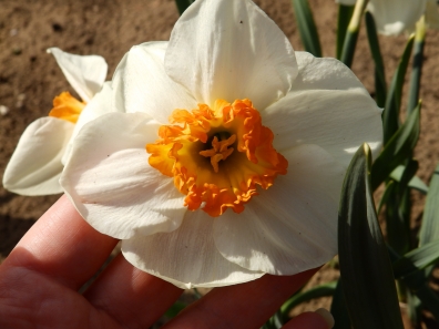 А вот это мой любимый сорт, поэтому название помню: Вайт чирфулнес. Стебель 30-40см, на нём до 5-6 цветков. Неполегает. 3 луковицы и целый букет. Цветет позже всех. Есть точно такой же с желтыми цветками, посадила этой осенью.