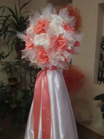 Для изготовления тортика из шоколадок взяла за основу вырезанный круглый пенопласт, сбоку прикрепила сладости, украсила ленточками, цветочками. В середину шоколадок вставляла предсказания для гостей, так как делала на свадьбу племяннику.
