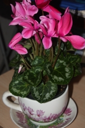Сегодня собирала подарок родственнице. Она не попала в компанию дам, одаренных мной цикламенами в декабре. Поэтому я цикламен погрузила в кашпо бесподобной формы - эдакий гигантский бокальчик с блюдцем. Узор на бокале - цикламены! Ну что ещё нужно фанату цикламена? По-моему, ничего! Ан нет, мне ещё и кованная роза приглянулась! Но подарю я её чуть позже, на другой праздник этой даме, который на подходе!