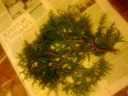Подобрала сегодня прямо на асфальте веточку туи, деревца растут рядом, за забором школьного двора - компактненькие такие кустарнички высотой не больше метра.
