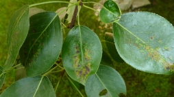 При виде желто-коричневого налета на листьях груши в виде пятен, можно диагностировать такое заболевание, как парша.