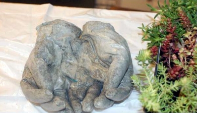 Резиновые перчатки набиваются разведенным цементом, а разной ветошью в тазике придается форма.