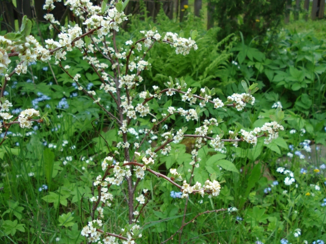 Похоже на терносливу, уже не тёрн, потому что нет колючек, но еще и не слива. Мичурин любил заниматься гибридами тёрна. У моего дедушки на участке росло нечто подобное, кора красноватая, цветы кучками, пятилепестковые. Ягода гораздо крупнее, чем у тёрна, обалденно вкусная и сочная после первых заморозков. Как только появятся листья, сравните их с картинками в интернете, по листьям проще определить вид.