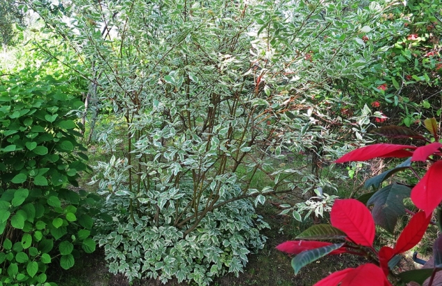 Оксана, с красными листьями — пуансеттия. Снимала с веранды, сныть хорошо закрывает нижние голые ветки дёрна — кустарники посажены на северной стороне, и обрезку, чтобы «шариком» был, не всегда удается сделать во время…