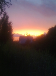 В субботу была гроза, сильная, выбило электричество, оторвало дверь в сарайчике - забыли запереть. Но все когда-нибудь кончается, и дождь в том числе - почему бы не пойти на рыбалку - пруд-то под боком ) Пылающий закат и радуга над ним ... Красоты !