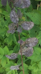 3. На листьях барбариса, да и жимолости появился белый налет. Если потереть, легко снимается. Выглядит так, как будто чем то белым облили листья. Фото 4 и 5