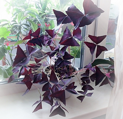 Это совсем другая кислица, комнатная.Она растет из клубеньков, цветет нежными сиреневыми колокольчиками… Была у меня ещё кислица с зелено- бордовыми листьями, цвела розовыми колокольчиками, пропала…
