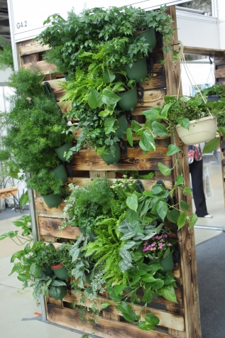 Мне понравилось сочетание деревянных опор и подвесных на канат полочек с яркими пластиковыми горшками! Особенно - сборные горшки - а-ля подвесная стена!