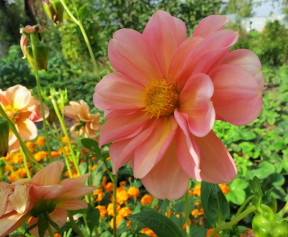 Сняли очередную порцию баклажанов и перчиков, черри- сладкиееее,брюссельская кочанчики набирает,виноград -скромный розовый ,а изабелла порадовала...Антоновка в этом году удалась.И цветочки- безвременники ,веселые ребята...сегодня даже бабочки летали! Внучка - помощница с тыквой...а это мои комнатные питомцы временно с подставки на газон перебрались -окно на веранде доделывали и пришлось подставку временно убрать ...