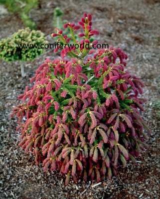 Ель обыкновенная Пуш ( Picea abes Pusch). Это миниатюрная форма знаменитого сорта Акрокона (Acrocona фото 6), который славится яркими красными шишечками на концах побегов. Очень интересный сорт!