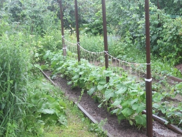 У меня есть металлический уголок 45х45 и длиной шесть метров, вот для него я вбиваю вертикально по всей длине грядки четыре-пять штук опор уже металлических( если нет металлических, подходят и деревянные опоры), примерно моего роста.