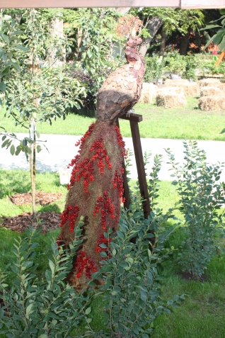 Эти великолепные птицы - эдакий вариант букета! Красная из яблок и розовых лепестков собрана, а вторая - из щепы и веток калины (кажется). Напоминает фигурки животных из хризантем. Смотрится очень эффектно! Можно для праздника урожая - необычно!
