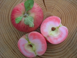 Мякоть яблока обладает выраженным розовым, иногда даже красным цветом с перламутровым жемчужным отливом, мелкозернистая и очень сочная. Вкус тоже не разочаровывает: сладкий, терпковатый, содержит нотки грейпфрута и малины.