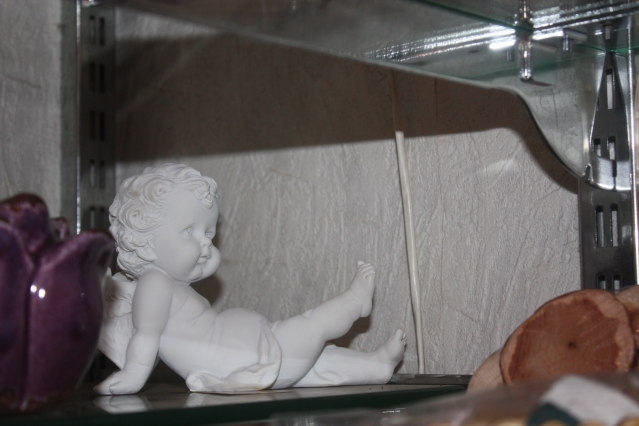 Набрала всяких пустяков на распродаже - соблазнительное это дело... Свечка- медовая, аромат умопомрачительный! кашпо скромненькое, но забавное - как мешочек. Композиция с ангелочком - и ангелочек лежащий - смотрятся хорошо. Шар в дедом морозом внутри - дед на куче денег сидит в санях - символично!