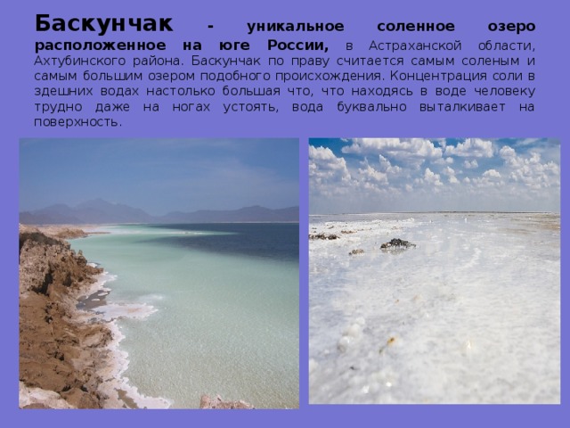 Озеро Баскунчак — самое соленое озеро в мире. Оно располагается на вершине гигантской соляной горы. Местные жители называют Баскунчак озером солнца, потому что в безоблачные дни его поверхность вспыхивает ослепительным светом.