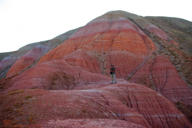 "В Прикаспийской степи жили когда-то два богатыря: отец и сын. Своего хозяйства у них не было, поэтому пасли они отары чужих овец. В ту пору в степи не было ни бугра, ни холмика. Когда весной поднималась высокая трава, за ней не видно было животных и скрывавшихся в степи хищников. Однажды отец с сыном отправились на Урал. При возвращении домой они уговорились захватить с собой с Уральских гор по глыбе уральского камня. Отец взял большую, а сын поменьше. Дорога дальняя. Путь трудный. Младший богатырь стал изнемогать. Он снял с себя ношу, прилег отдохнуть, но тут же и умер. Похоронив сына, отец отправился дальше. Ему хотелось донести глыбу до родной кибитки. Проходя берегом соленого озера, он вздумал взять в рот щепотку соли. Но как только нагнулся за солью, гора всей своей тяжестью навалилась на него. Богатырь упал, а земля вокруг окрасилась в багряный цвет, отчего и поныне она красная.