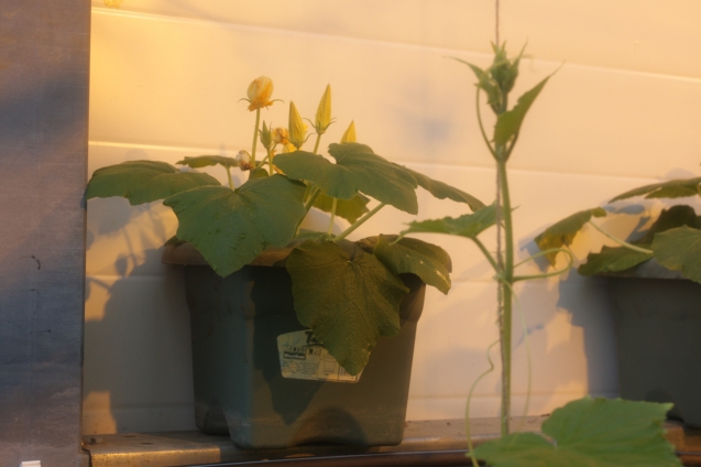 Перец "родил" -таки перчинку, который цвёл. А вот в горшке огурчик - просто заморыш был - в грядке бы не выжил- темно под плетями.