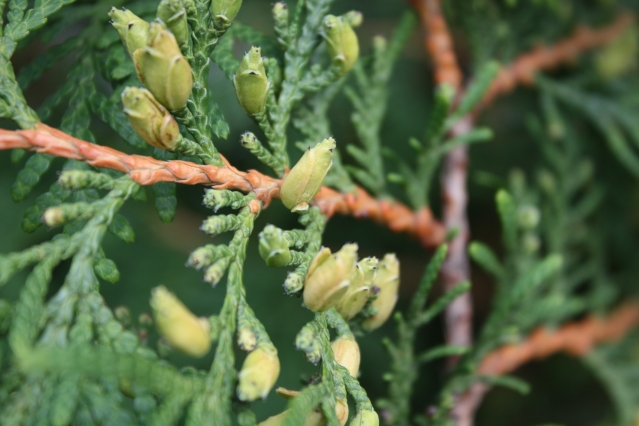 Туя западная (Thuja occidentalis): 'Aureospicata' (высокая, с золотистыми кончиками побегов), 'Stolvijk' (средняя, с пёстрыми, жёлто-белыми приростами), 'Anneke' (компактная, золотистая).