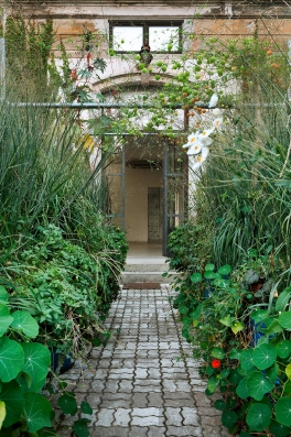 а вот кусочек анархического сада самой Паолы — с травами, вьюнами и кустарниками, высаженными в бочки цвета индиго, его Паола создала совместно с ландшафтным архитектором Стефано Баккари