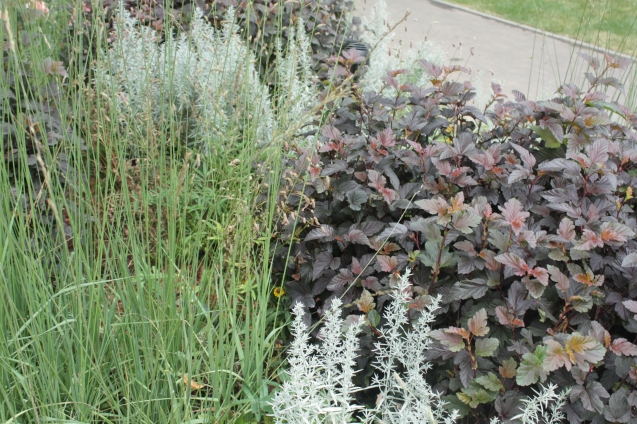 Для спирей и барбарисов пришлось выбирать места посуше. Зато лох и пузыреплодники растут повсюду в самых разных комбинациях. Очень эффектно сочетание лоха серебристого с кленом Гиннала, у которого в середине осени листья приобретают ярко-красный цвет. Клен растет в виде куста – так сформировало его регулярное подмерзание.